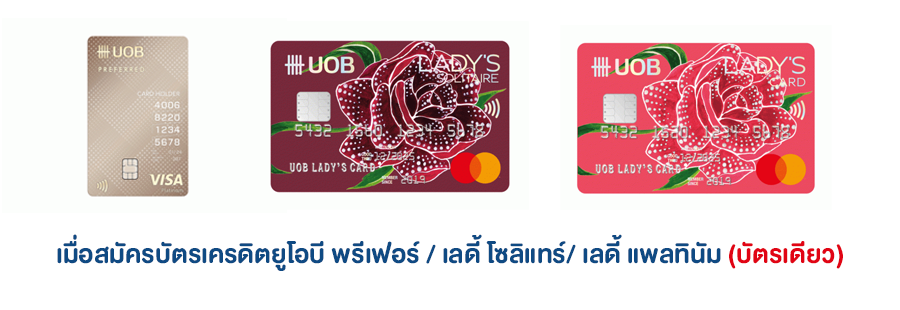 - โปรโมชั่นนี้ให้เฉพาะบัตรเครดิตยูโอบี พรีวิไมลส์/พรีเฟอร์ /เลดี้ โซลิแทร์/เลดี้ แพลทินัม/โยโล่ แพลทินัม ที่ออกในประเทศไทยเท่านั้น ยกเว้นบัตรเครดิตเพื่อธุรกิจและบัตรเครดิต TMRW โดยผู้ถือบัตรจะต้องคงสถานะการเป็นสมาชิกบัตรเครดิต และไม่ผิดนัดชำระหนี้จนถึงวันที่ธนาคารมอบของกำนัล/คะแนนสะสม UOB Reward Plus/เครดิตเงินคืน