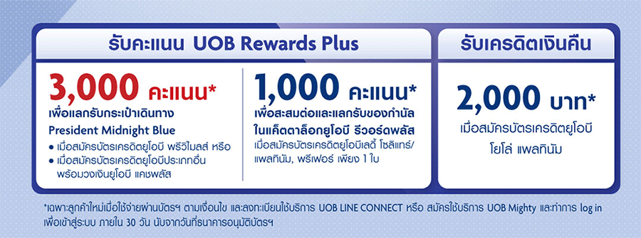 - ธนาคารจะมอบคะแนนสะสม UOB Reward Plus 1,000 คะแนนให้ผู้ถือบัตรเครดิต (บัตรหลัก) ภายใน 60 วันนับจากวันที่มีการใช้จ่ายผ่านบัตรเครดิตครบตามเงื่อนไขข้างต้นและลงทะเบียนการใช้บริการ UOB LINE CONNECT หรือ สมัครใช้บริการ UOB Mighty และทำการ log in เพื่อเข้าสู่ระบบ โดยผู้ถือบัตรสามารถสะสมคะแนนต่อเพื่อแลกรับของกำนัลในแค็ตตาล็อก UOB Reward Plus จนกว่าคะแนนจะหมดอายุ