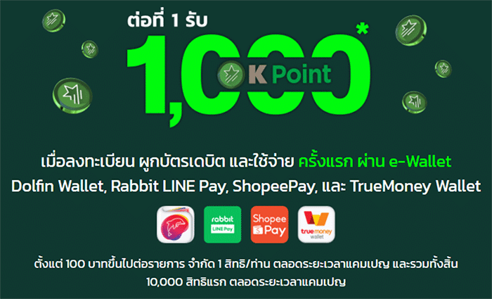 - รับคะแนน 1,000 K Point เมื่อผูกบัตรเดบิตของ บมจ. ธนาคารกสิกรไทย ("ธนาคาร") ครั้งแรกและใช้จ่ายผ่านบัตรดังกล่าวด้วย e-Wallet ที่ร่วมรายการ ได้แก่ Dolfin Wallet, Rabbit LINE Pay, ShopeePay และ Truemoney Wallet ตั้งแต่ 100 บาทขึ้นไปต่อรายการ