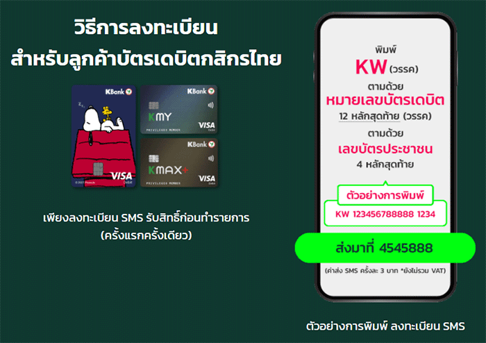 - สิทธิพิเศษนี้เฉพาะผู้ลงทะเบียนก่อนทำรายการ โดยส่ง SMS : พิมพ์ KW(เว้นวรรค) ตามด้วยเลขบัตรเดบิต 12 หลักสุดท้าย (เว้นวรรค) เลขบัตรประชาชน 4 หลักสุดท้าย ส่งมาที่ 4545888 (ค่าส่ง SMS 3 บาทต่อครั้ง ยังไม่รวม VAT) และได้รับข้อความตอบกลับ