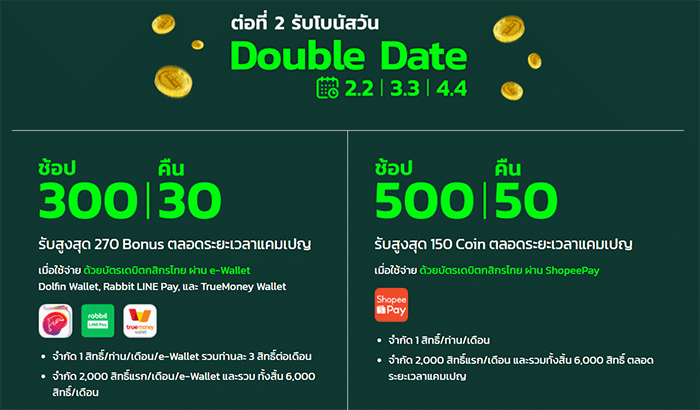 - รับ 50 Coin เมื่อใช้จ่ายผ่านบัตรเดบิตกสิกรไทยด้วย ShoppePay 500 บาทขึ้นไปต่อรายการ ในวันที่ 2 กุมภาพันธ์ 2565, 3 มีนาคม 2565 และ 4 เมษายน 2565 เท่านั้น
