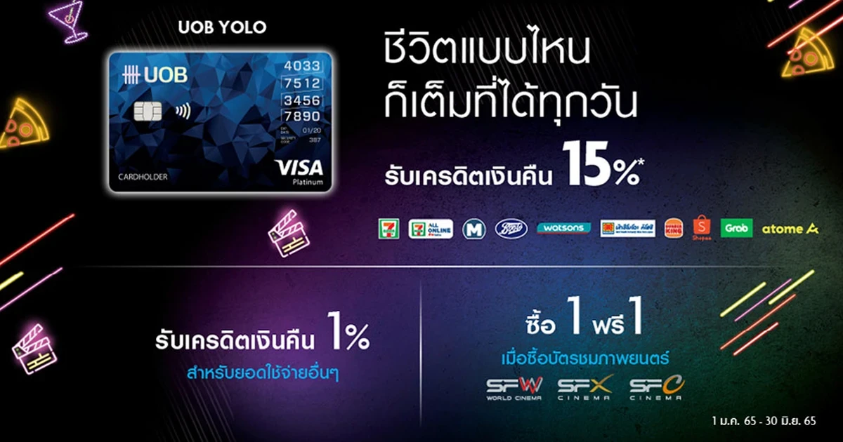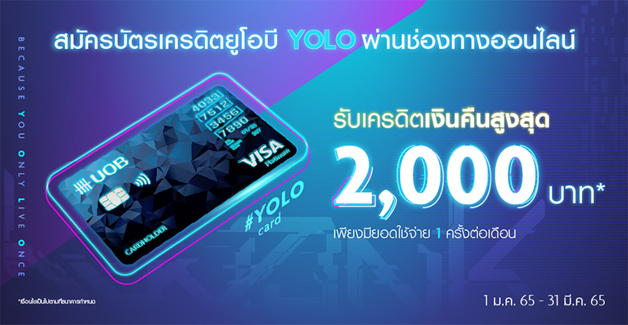 - โปรโมชั่นนี้ระหว่างวันที่ 1 ม.ค. 65 – 31 มี.ค. 65 สำหรับลูกค้าใหม่ที่สมัครบัตรเครดิตยูโอบี โยโล่ แพลทินัม ผ่านช่องทางออนไลน์เท่านั้น และได้รับการอนุมัติบัตรเครดิตจากธนาคารภายในวันที่ 17 เม.ย. 65
