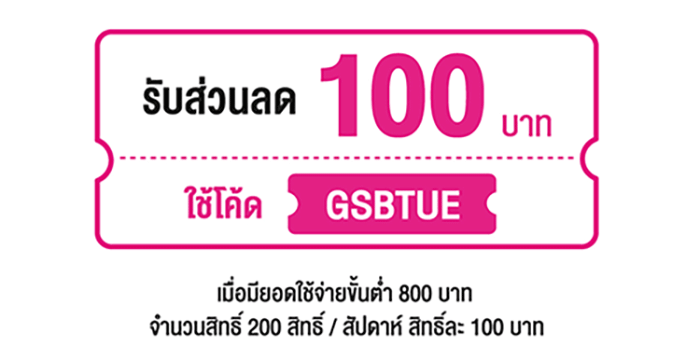 สิทธิพิเศษสำหรับผู้ถือบัตรเครดิตธนาคารออมสิน เพียงใช้จ่ายผ่านบัตรเครดิตธนาคารออมสินตั้งแต่ 800 บาทขึ้นไป/ เซลล์สลิป รับส่วนลด 100 บาท เมื่อกรอกรหัสส่วนลด GSBTUE (จำกัดจำนวน 200 สิทธิ์ ทุกวันอังคาร) ตลอดทั้งปี