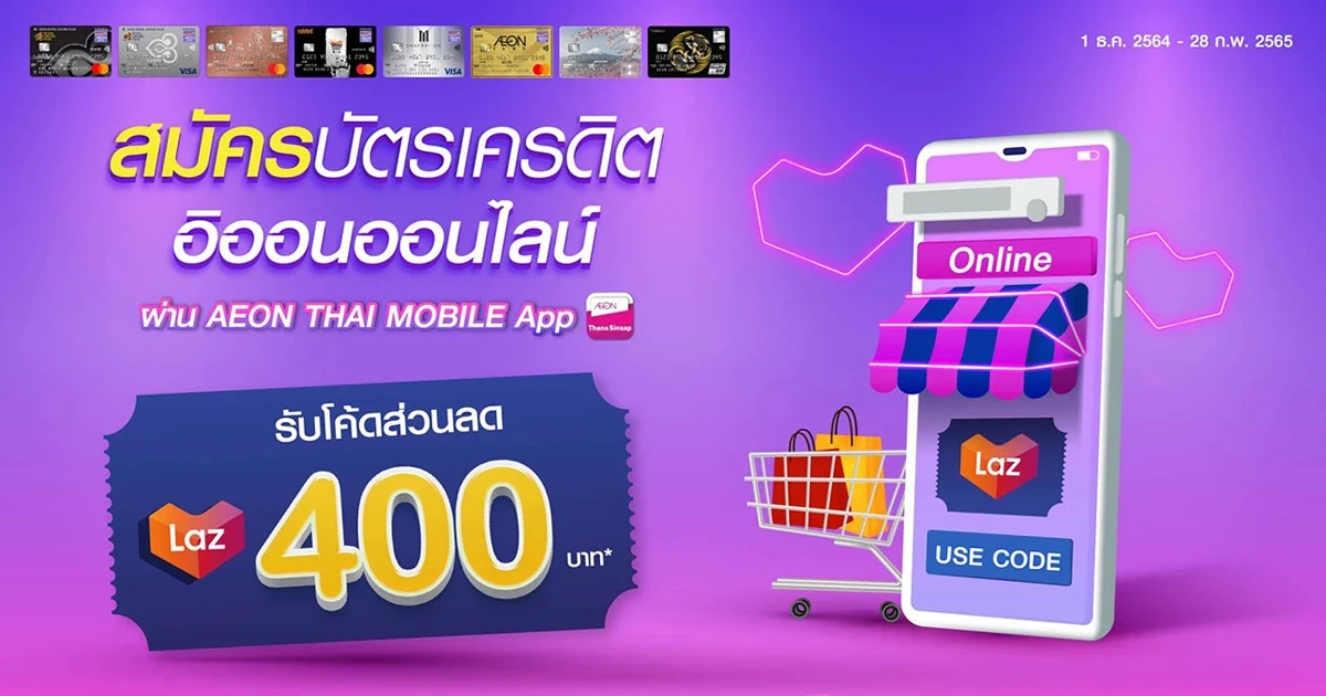สมัครบัตรเครดิตอิออนออนไลน์ ผ่าน AEON THAI MOBILE App รับโค้ดส่วนลดลาซาด้า มูลค่า 400 บาท