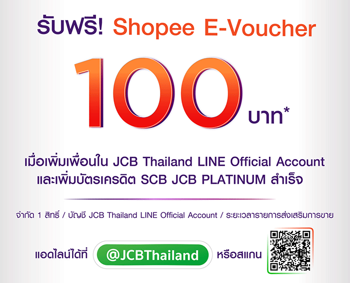 เมื่อเพิ่มเพื่อนใน JCB Thailand LINE Official Account และเพิ่มบัตรเครดิต SCB JCB Platinum สำเร็จภายในระยะเวลากิจกรรม หรือจนกว่าสิทธิ์จะหมด รับฟรี Shopee E-Voucher มูลค่า 100 บาท จำกัด 1 สิทธิ์ / บัญชี JCB Thailand LINE Official Account / ระยะเวลารายการส่งเสริมการขาย