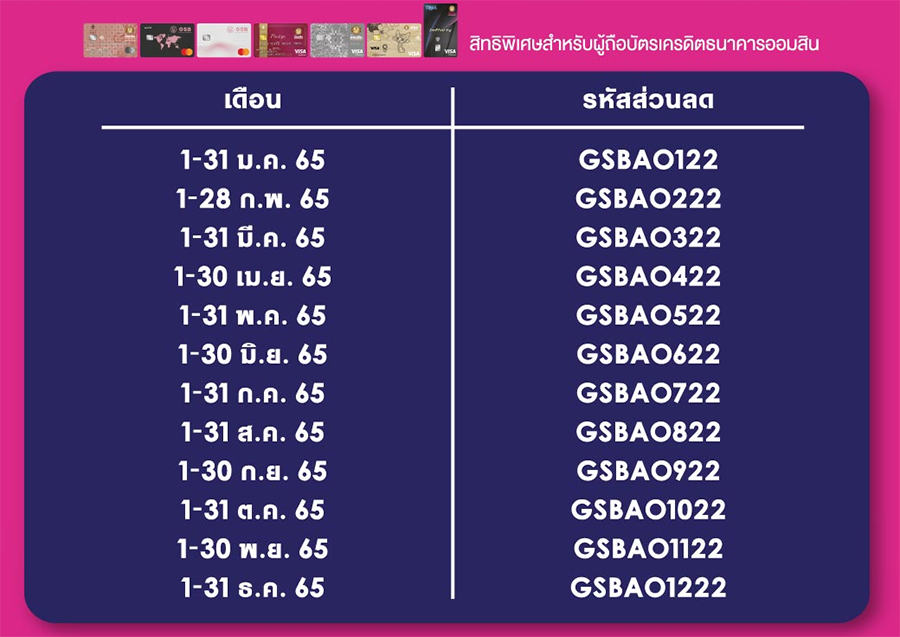 จำกัดจำนวน 6,000 สิทธิ์ ตลอดรายการ / สำหรับบัตรเครดิตธนาคารออมสินทุกประเภท 1 ม.ค. - 31 ธ.ค. 2565 (ทุกวัน)