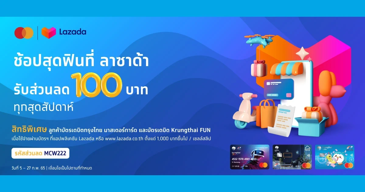 - สิทธิพิเศษตามรายการส่งเสริมการขายนี้ สำหรับลูกค้าผู้ถือบัตรเดบิตกรุงไทย มาสเตอร์การ์ด และบัตรเดบิต Krungthai FUN (“ลูกค้า”) ของธนาคารกรุงไทย จำกัด (มหาชน) (“ธนาคารกรุงไทย”) เมื่อมียอดใช้จ่ายผ่านแอปพลิเคชัน Lazada หรือเว็บไซต์ www.lazada.co.th (“ร้านค้า”) ระหว่างวันที่ 5 กุมภาพันธ์ 2565 - 27 กุมภาพันธ์ 2565 (ทุกวันเสาร์ - วันอาทิตย์) หรือจนกว่าจะครบจำนวนตามสิทธิ์ที่กำหนด
