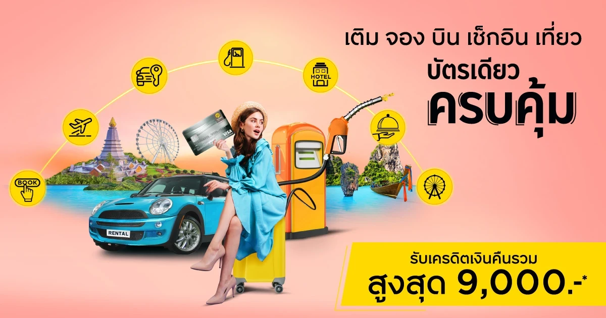 เติม จอง บิน เช็กอิน เที่ยว รับเครดิตเงินคืนรวมสูงสุด 9,000 บาท*,** + แลกพอยต์รับเครดิตเงินคืนเพิ่มสูงสุด 13%*** เมื่อใช้จ่ายหมวดที่ร่วมรายการ