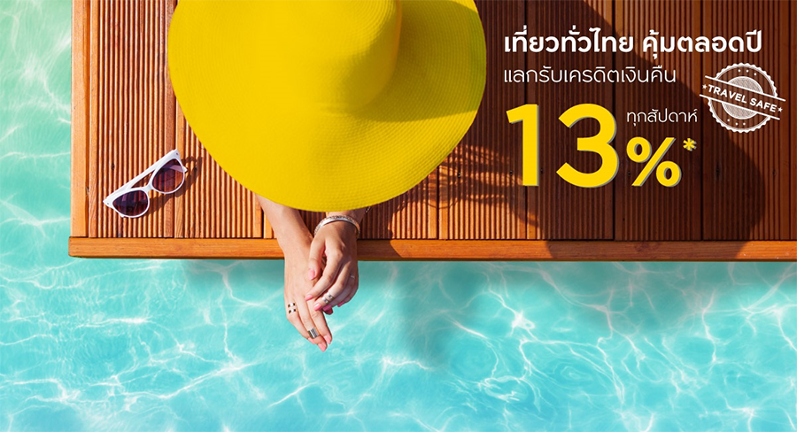 แลกรับเครดิตเงินคืน 13%* ทุกสัปดาห์ เพียงมียอดใช้จ่ายตั้งแต่ 2,500 บาทขึ้นไป/เซลล์สลิป ในหมวดท่องเที่ยวภายในประเทศที่ร่วมรายการ ได้แก่