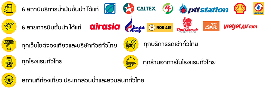 - 6 แบรนด์สถานีน้ำมันชั้นนำ ได้แก่ บางจาก ,คาลเท็กซ์,พีที ,พีทีที สเตชั่น,เชลล์ และ ซัสโก้
