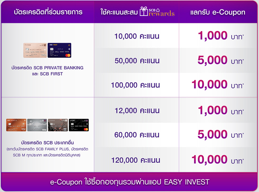 - สิทธิพิเศษสำหรับผู้ถือบัตรเครดิตไทยพาณิชย์ทุกประเภท ยกเว้นบัตรเครดิต SCB Family Plus, บัตรเครดิต SCB M ทุกประเภท และบัตรเครดิตนิติบุคคล ("ผู้ถือบัตร") สามารถใช้คะแนนสะสม SCB Rewards ตั้งแต่ 10,000 – 120,000 คะแนน เพื่อแลกรับ e-Coupon ผ่านเมนูแลกของรางวัลบนแอปพลิเคชัน SCB EASY ระหว่างวันที่ 1 มีนาคม 2565 – 31 มกราคม 2566 หรือ จนกว่าสินค้าจะหมด เพื่อเป็น e-Couponในการซื้อกองทุนรวม (Mutual Fund) ทุกกองทุน