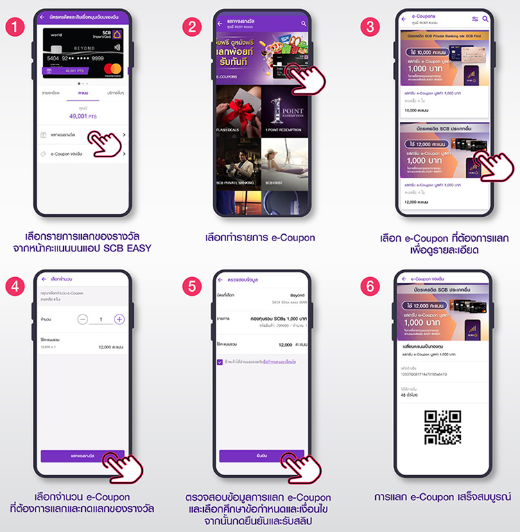 - สามารถใช้คะแนนสะสม SCB Rewards ทำรายการแลก e-Coupon บนแอป SCB EASY ได้สูงสุด 5 e-Coupon/ครั้ง และ ไม่จำกัดจำนวนครั้งในการทำรายการตลอดระยะเวลาโครงการ