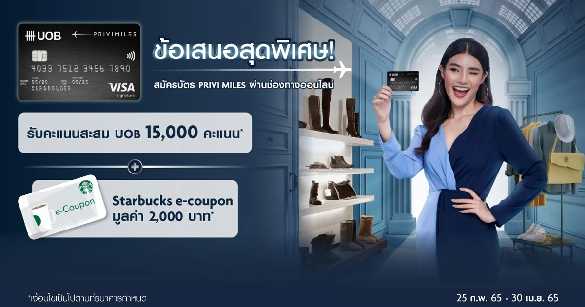 สมัครบัตรพรีวิไมลส์ทางออนไลน์ รับสูงสุด 15,000 คะแนน และ Starbucks e-Coupon 2,000 บาท สำหรับลูกค้าใหม่ที่สมัครบัตรเครดิตยูโอบี พรีวิไมลส์ และใบสมัครได้รับการอนุมัติจากธนาคารภายในวันที่ 13 พ.ค. 65