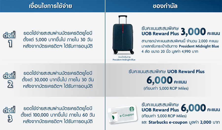 - ต่อที่1 รับคะแนนสะสมพิเศษ UOB Reward Plus 3,000 คะแนน เมื่อมียอดใช้จ่ายสะสมผ่านบัตรเครดิตยูโอบี ตั้งแต่ 5,000 บาทขึ้นไป ภายใน 30 วัน หลังจากบัตรเครดิตฯ ได้รับการอนุมัติ ผู้ถือบัตรสามารถนำคะแนนสะสมพิเศษนี้ จำนวน 2,000 คะแนน มาแลกรับกระเป๋าเดินทาง President Midnight Blue 4 ล้อ ขนาด 20 นิ้ว มูลค่า 4,990 บาท ภายใน 60 วันนับจากวันที่ท่านได้รับ SMS ยืนยันการมอบคะแนนสะสม UOB Reward Plus จากธนาคาร หรือท่านสามารถเลือกสะสมคะแนนต่อเพื่อแลกรับของกำนัลในแค็ตตาล็อก UOB Reward Plus จนกว่าคะแนนจะหมดอายุ