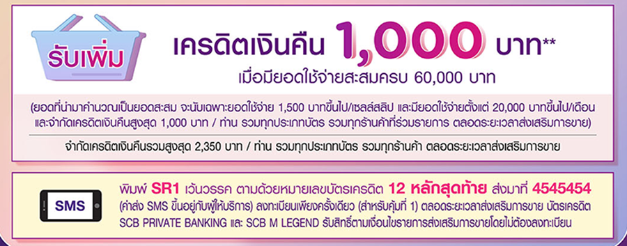 - ลงทะเบียน SMS คุ้มที่ 1 พิมพ์ SR1 เว้นวรรค ตามด้วยหมายเลขบัตรเครดิต 12 หลักสุดท้าย ส่งมาที่ 4545454 (ค่าส่ง SMS ขึ้นอยู่กับผู้ให้บริการ) และจะต้องได้รับข้อความตอบรับยืนยันการเข้าร่วมรายการ โดยลงทะเบียน เพียงครั้งเดียวตลอดระยะเวลาส่งเสริมการขายนี้ เพื่อรับสิทธิ์คุ้มที่ 1 ทั้งนี้ บัตรเครดิต SCB PRIVATE BANKING และ SCB M LEGEND รับสิทธิ์ตามเงื่อนไขรายการส่งเสริมการขายโดยไม่ต้องลงทะเบียน