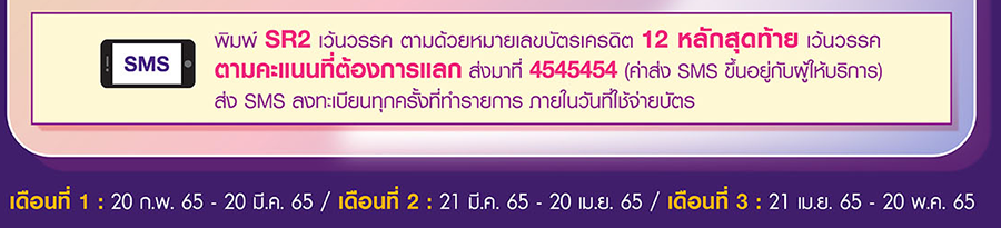 - ลงทะเบียน SMS คุ้มที่ 2 พิมพ์ SR2 วรรค ตามด้วยหมายเลขบัตรเครดิต 12 หลักสุดท้าย วรรคตามด้วยยอดชำระผ่านบัตรฯ ที่ต้องการแลกคะแนน ส่งมาที่ 4545454 (ค่าส่ง SMS ขึ้นอยู่กับผู้ให้บริการ) และจะต้องได้รับข้อความตอบรับยืนยันการเข้าร่วมรายการ กรุณาระบุยอดพร้อมเศษทศนิยม (ถ้ามี) โดยการแลกคะแนน จะแลกได้เฉพาะยอดเต็มจำนวนเท่านั้น (ไม่รวมทศนิยม) เช่น ยอดใช้จ่าย 1,561.25 บาท พิมพ์ SMS ระบุ 1561.25 โดยธนาคารจะแลกคะแนนเป็นเครดิตเงินคืนจำนวน 1,561 คะแนน