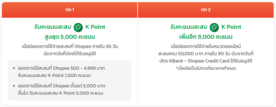 ต่อที่ 2 รับคะแนนสะสม K Point เพิ่ม 9,000 คะแนนเมื่อมียอดการใช้จ่ายออนไลน์สะสมครบ 50,000 บาท ภายใน 90 วัน นับจากวันที่บัตร KBank - Shopee Credit Card ได้รับอนุมัติ - จำกัดสิทธิ์การรับคะแนนสะสม K Point 1 สิทธิ์/ท่าน (สูงสุดไม่เกิน 14,000 คะแนน/ท่าน) ตลอดระยะเวลาส่งเสริมการขาย