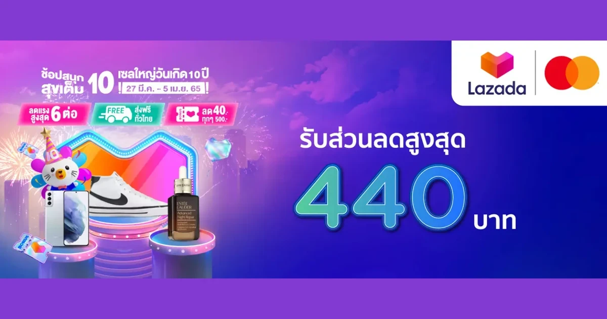 - สิทธิพิเศษสำหรับสมาชิกบัตรเครดิตเคทีซี มาสเตอร์การ์ดทุกประเภทที่ช้อปผ่าน Lazada App หรือ เว็บไซต์ www.lazada.co.th เมื่อช้อปครบตั้งแต่ 1,999 บาทขึ้นไปต่อยอดซื้อก่อนหักส่วนลดทุกประเภทและไม่รวมค่าขนส่ง สำหรับการซื้อสินค้าที่ร่วมรายการ ส่วนลดที่ 1 รับส่วนลด 250 บาท โดยกรอกรหัสส่วนลด "KTCMCMGW322" ในช่องกรอกรหัส และเลือกบัตรเครดิตเคทีซี มาสเตอร์การ์ดก่อนการชำระเงินเท่านั้น โดยขอจำกัดการรับสิทธิ์เฉพาะ 460 ท่านแรกตลอดรายการส่งเสริมการขายนี้ และ ส่วนลดที่ 2 รับส่วนลด 190 บาท บาท โดยกรอกรหัสส่วนลด "KTCMCMG322" ในช่องกรอกรหัส และเลือกบัตรเครดิตเคทีซี มาสเตอร์การ์ดก่อนการชำระเงินเท่านั้น โดยขอจำกัดการรับสิทธิ์เฉพาะ 5,447 ท่านแรกตลอดรายการส่งเสริมการขายนี้โดยสิทธิ์จะถูกปล่อยตามช่วงเวลาดังต่อไปนี้ (1) เวลา 00.00 น. ของวันที่ 27 มี.ค. 65, (2) เวลา 10.00 น. ของวันที่ 27 มี.ค. 65, (3) เวลา 10.00 น. ของวันที่ 28 มี.ค. 65, (4) เวลา 10.00 น. ของวันที่ 29 มี.ค. 65, (5) เวลา 10.00 น. ของวันที่ 30 มี.ค. 65, (6) เวลา 10.00 น. ของวันที่ 31 มี.ค. 65, (7) เวลา 10.00 น. ของวันที่ 01 เม.ย. 65, (8) เวลา 10.00 น. ของวันที่ 02 เม.ย. 65 และ (9) เวลา 10.00 น. ของวันที่ 03 เม.ย. 65