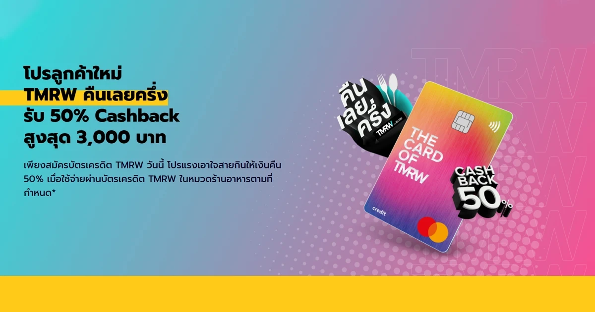 โปรโมชั่นสมัครบัตรเครดิต TMRW คืนเลยครึ่ง รับ 50% Cashback ในหมวดร้านอาหาร