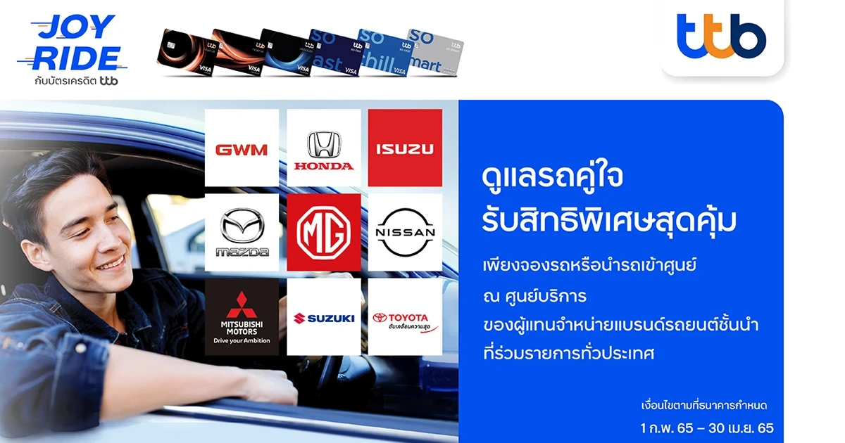 - เฉพาะผู้ถือบัตรเครดิตทีทีบี บัตรเครดิตทีเอ็มบี บัตรเครดิตธนชาต ประเภทบัตรสำหรับบุคคลธรรมดาเท่านั้น ที่มียอดใช้จ่ายผ่านบัตรเครดิตแบบเต็มจำนวนต่อเซลล์สลิปและลงทะเบียนถูกต้องตามเงื่อนไข ณ ศูนย์บริการผู้แทนจำหน่ายอย่างเป็นทางการของแบรนด์รถยนต์ที่ร่วมรายการ ได้แก่ เกรท วอลล์ มอเตอร์, ฮอนด้า, อีซูซุ, มาสด้า, เอ็มจี, มิตซูบิชิ, นิสสัน, ซูซุกิ, และ โตโยต้า ระหว่างวันที่ 1 กุมภาพันธ์ 2565 – 30 เมษายน 2565