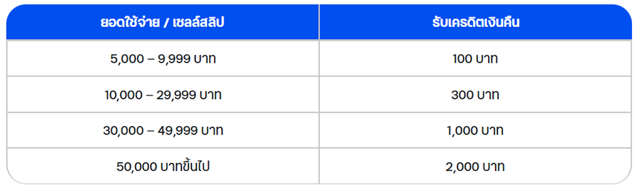 - จำกัดเครดิตเงินคืนสูงสุด 10,000 บาท / บัญชีบัตรหลัก / ตลอดรายการ