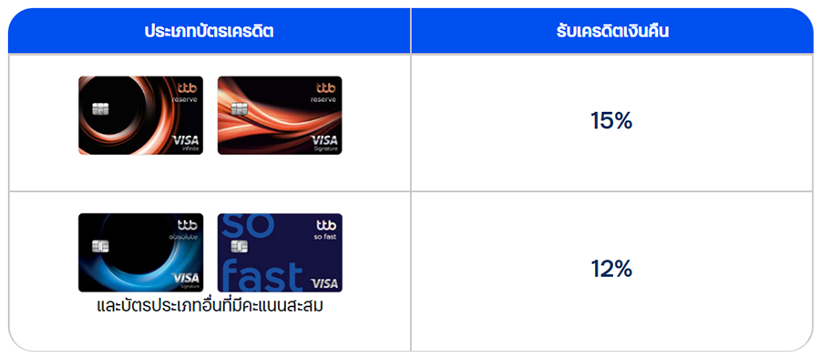 - เฉพาะบัตรเครดิต ttb reserve infinite / ttb reserve signature: รับเครดิตเงินคืน 15%