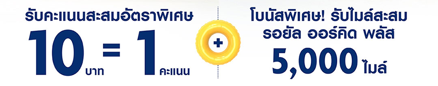 - รับไมล์สะสม รอยัล ออร์คิด พลัส 5,000 ไมล์ เมื่อมียอดใช้จ่ายสะสมตลอดรายการส่งเสริมการขายตั้งแต่ 500,000 บาทขึ้นไปต่อผู้ถือบัตรหลัก (จำกัดการรับไมล์สะสมสูงสุด 5,000 ไมล์/ผู้ถือบัตรหลัก ตลอดรายการ)