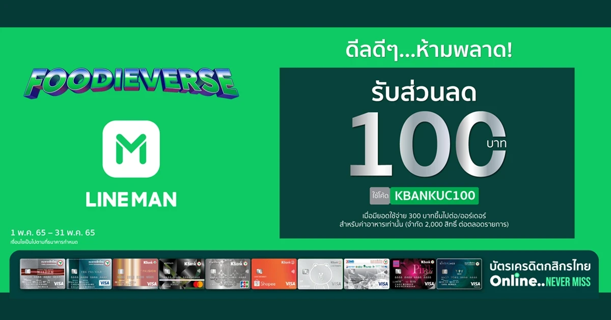 สิทธิพิเศษบัตรเครดิตกสิกรไทย เมื่อสั่งอาหารที่ Line Man รับส่วนลด 100 บาท เพียงใส่โค้ด KBANKUC100 เมื่อมียอดใช้จ่าย 300 บาทขึ้นไป/ออร์เดอร์ (ค่าอาหารเท่านั้น) (จำกัด 2,000 สิทธิ์ ต่อตลอดรายการ)