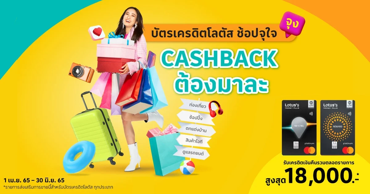 - จำกัดเครดิตเงินคืนสูงสุด 6,000 บาท / บัญชีบัตรหลัก / เดือน หรือไม่เกิน 18,000 บาท / บัญชีบัตรหลัก / ตลอดรายการ