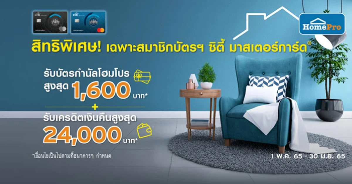 - ต่อที่ 1 รับบัตรของขวัญโฮมโปรสูงสุด 1,600 บาท เมื่อใช้จ่ายผ่านบัตร ซิตี้ มาสเตอร์การ์ด แบบเต็มจำนวน ที่โฮมโปรทุกสาขา