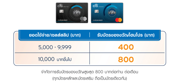- สงวนสิทธิ์การรับบัตรของขวัญของรายการส่งเสริมการขายนี้ เฉพาะรายการใช้จ่ายแบบเต็มจำนวนผ่านบัตรเครดิตซิตี้ มาสเตอร์การ์ดที่ออกในประเทศไทยเท่านั้น