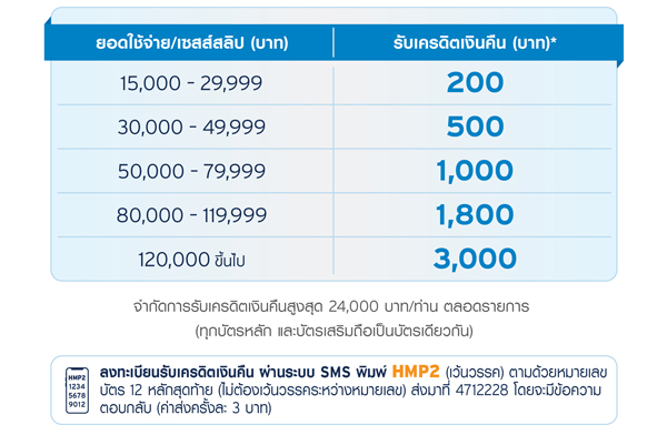 - ผู้ถือบัตรฯ จะต้องลงทะเบียนเพื่อรับเครดิตเงินคืนทาง SMS ภายในระยะเวลารายการส่งเสริมการขายเท่านั้น
