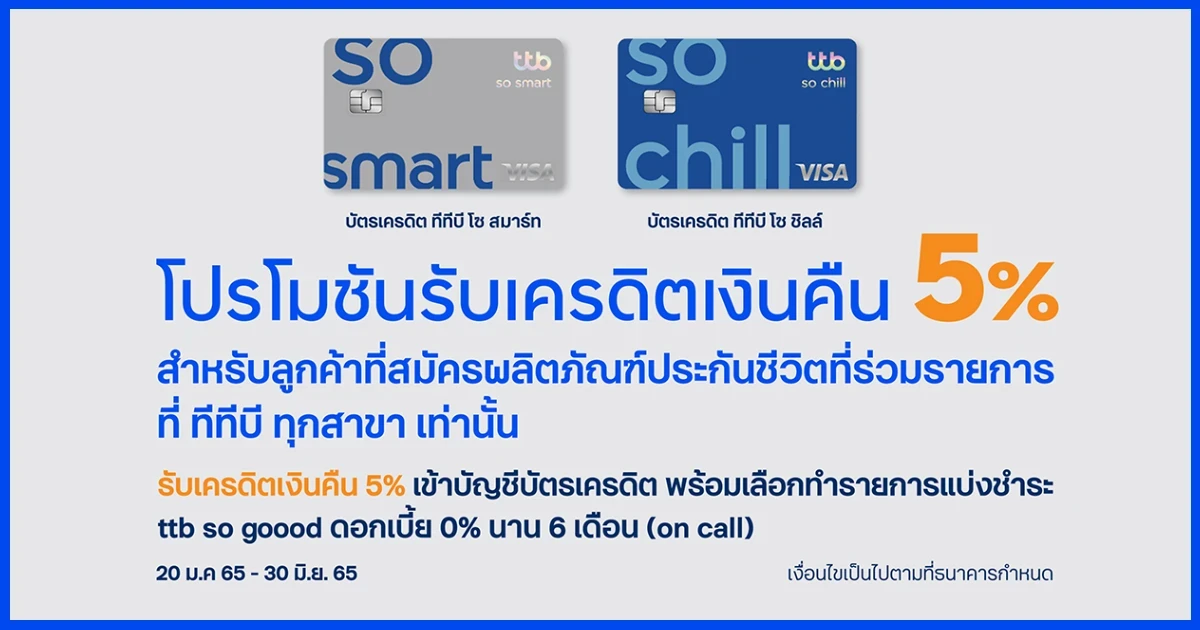 สิทธิพิเศษสำหรับผู้ถือบัตรเครดิต ทีทีบี โซ สมาร์ท และบัตรเครดิต ทีทีบี โซ ชิลล์ รับเครดิตเงินคืน 5% เข้าบัญชีบัตรเครดิต พร้อมเลือกทำรายการแบ่งชำระ ttb so goood ดอกเบี้ย 0% นาน 6 เดือน (on call)
