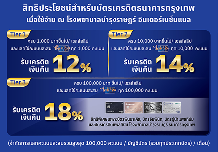- Tier 3 : สำหรับบัตรพินนาเคิล,บัตรอินฟินิท,บัตรผู้นำแพลทินัม และบัตรเครดิตแพลทินัม โรงพยาบาลบำรุงราษฎร์ ธนาคารกรุงเทพ ยอดใช้จ่าย 100,000 บาทขึ้นไป/เซลส์สลิปและแลกใช้คะแนนสะสมทุก 100,000 คะแนน รับเครดิตเงินคืน 18%