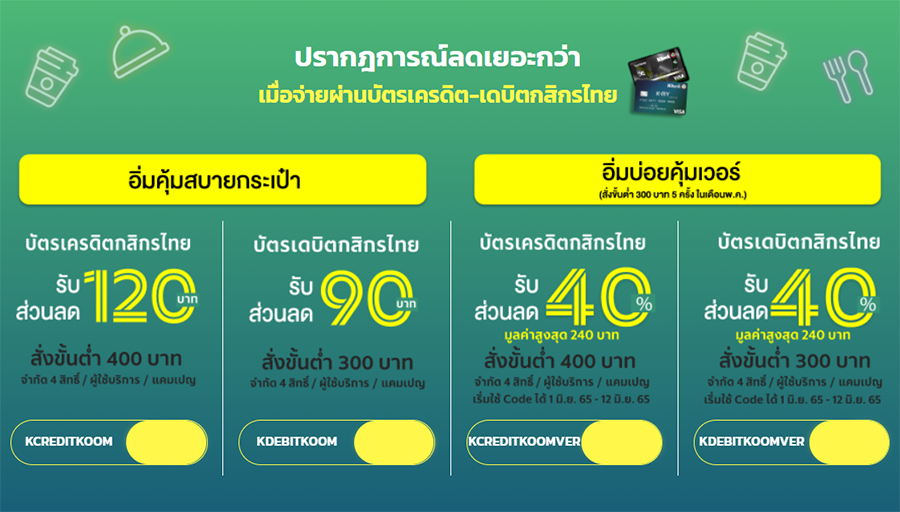 เงื่อนไขโค้ด KDEBITKOOMVER สำหรับการชำระค่าอาหารด้วยบัตรเครดิตธนาคารกสิกรไทย