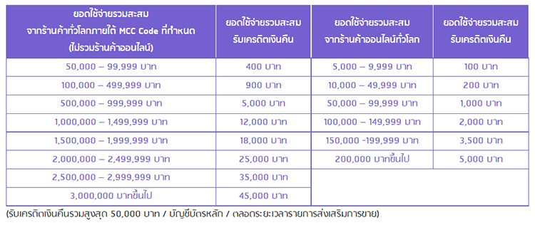 - เมื่อมียอดใช้จ่ายรวมสะสมตั้งแต่ 3,000,000 บาทขึ้นไป รับเครดิตเงินคืน 45,000 บาท