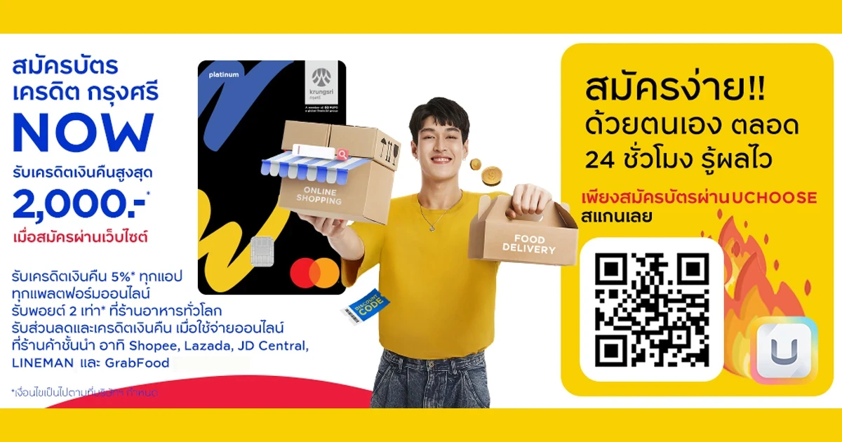โปรโมชันสมัครบัตรเครดิต กรุงศรี นาว ผ่านช่องทางเว็บไซต์ วันนี้ รับเครดิตเงินคืนสูงสุด 2,000 บาท* เมื่อมียอดใช้จ่ายผ่านบัตรตามเงื่อนไขต่อเนื่องกันครบ 60 วัน