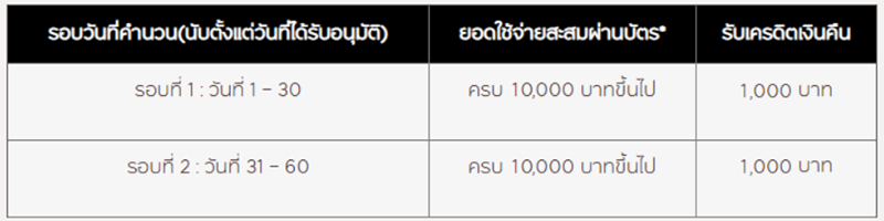 - บริษัทฯ จะคำนวนเครดิตเงินคืนทั้งหมด 2 รอบ (ทุกๆ 30 วัน เป็นระยะเวลาต่อเนื่อง 60 วัน) โดยท่านสมาชิกบัตรใหม่จะได้รับเครดิตเงินคืนรอบละ 1,000 บาท เมื่อมียอดใช้จ่ายครบถ้วนตามเงื่อนไข