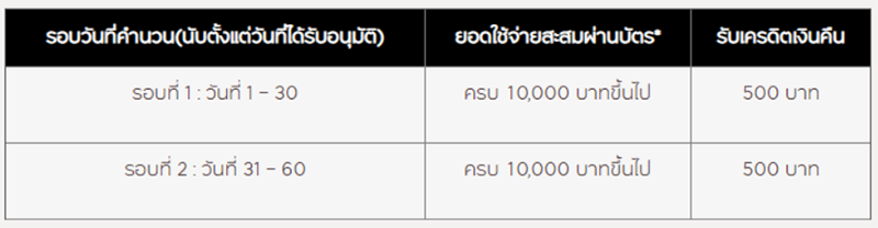 - บริษัทฯ จะคำนวนเครดิตเงินคืนทั้งหมด 2 รอบ (ทุกๆ 30 วัน เป็นระยะเวลาต่อเนื่อง 60 วัน) โดยท่านสมาชิกบัตรใหม่จะได้รับเครดิตเงินคืนรอบละ 500 บาท เมื่อมียอดใช้จ่ายครบถ้วนตามเงื่อนไข