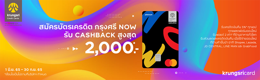 - สิทธิพิเศษนี้เฉพาะลูกค้าที่สมัครผ่าน www.krungsricard.com MSC 433 และได้รับการอนุมัติบัตรตั้งแต่ 1 มิ.ย. 65 – 30 ก.ย. 65 เท่านั้น