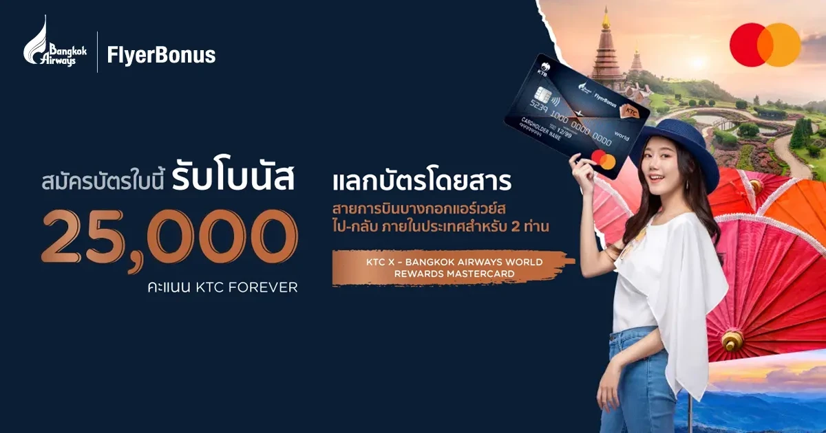 - รายการส่งเสริมการขายนี้ บริษัท บัตรกรุงไทย จำกัด (มหาชน) หรือเคทีซี จัดทำขึ้นเพื่อมอบสิทธิประโยชน์ให้เฉพาะสมาชิกบัตรเครดิต KTC X - BANGKOK AIRWAYS WORLD REWARDS MASTERCARD และ KTC X – BANGKOK AIRWAYS VISA SIGNATURE ("บัตรฯ") ตามเงื่อนไขที่กำหนดเท่านั้น