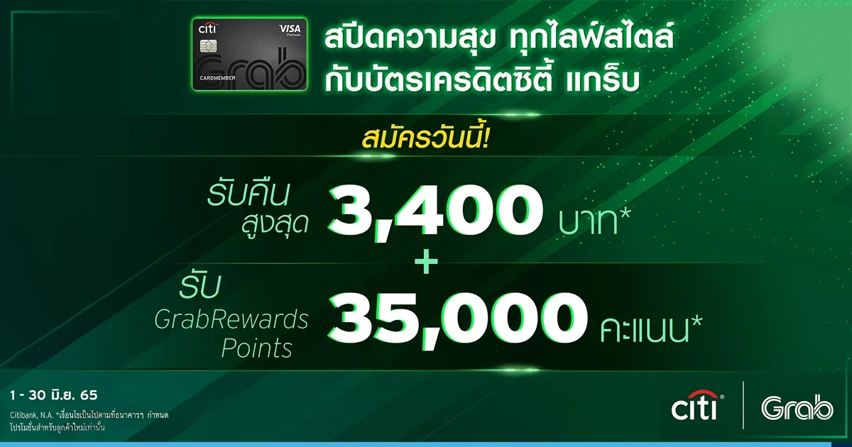 โปรโมชั่นพิเศษ...สำหรับลูกค้าใหม่ที่สมัครบัตรเครดิตซิตี้ แกร็บ ผ่านช่องทางออนไลน์ รับคืนสูงสุด 3,400 บาท*+ GrabRewards Points 35,000 คะแนน*