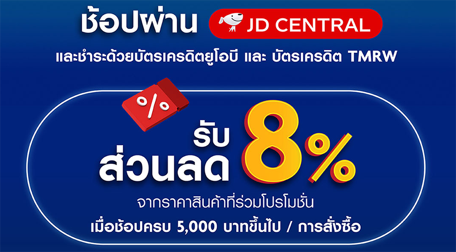 - เฉพาะท่านผู้มีบัญชีผู้ใช้ของ JD CENTRAL และชำระเงินค่าสินค้าผ่าน บัตรเครดิต ยูโอบี หรือบัตรเครดติ TMRW ตั้งแต่ 1 มิ.ย. 65 – 30 มิ.ย. 65 โดยมีมูลค่าการซื้อสินค้า 5,000 บาทขึ้นไป/การสั่งซื้อ จะมีสิทธิ์รับส่วนลด 8% จากราคาสินค้าที่ร่วมโปรโมชั่น