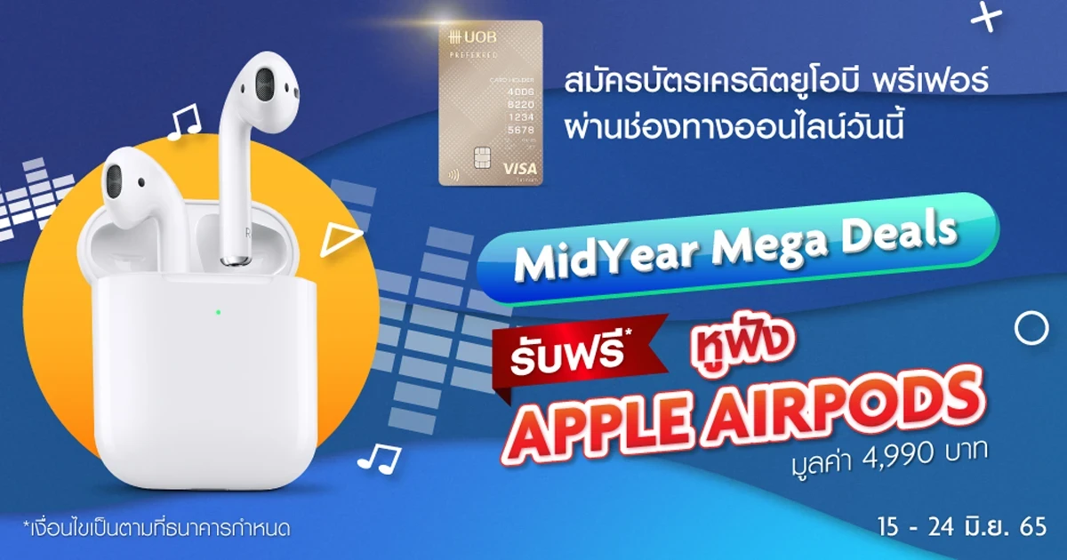 MidYear Mega Deals สมัครบัตรเครดิตยูโอบี พรีเฟอร์ ผ่านช่องทางออนไลน์วันนี้ รับฟรี หูฟัง APPLE AIRPODS มูลค่า 4,990 บาท