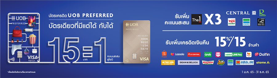 - บัตรเดียวที่มีแต่ได้ 15 บาท = 1 คะแนนสะสมยูโอบี ทุกๆยอดใช้จ่ายผ่านบัตรเครดิตยูโอบี พรีเฟอร์ 15 บาท รับคะแนนสะสม UOB Reward Plus เท่ากับ 1 คะแนน
