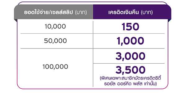 ต่อที่ 4 สำหรับสมาชิกบัตรเครดิตซิตี้ รอยัล ออร์คิด พลัส รับเครดิตเงินคืนเพิ่มอีก 1,000 บาท เมื่อแลกคะแนนสะสมซิตี้ รีวอร์ดทุก 4,000 คะแนน (รับ SMS จากธนาคารฯ และคลิกลิงก์เพื่อแลกคะแนนสะสม)