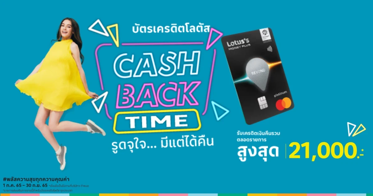 บัตรเครดิตโลตัส CASHBACK TIME รูดจุใจ... มีแต่ได้คืน จะรูดช้อปที่ร้าน, แตะเพื่อจ่าย หรือช้อปผ่านช่องทางออนไลน์ของร้านค้า ก็สะสมรวมได้ทุกหมวดทุกร้านที่ร่วมรายการ รับเครดิตเงินคืนรวมสูงสุด 21,000 บาท ตลอดรายการ*