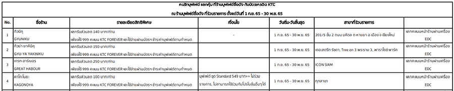 - รายการส่งเสริมการขาย ("รายการ") นี้ บริษัท บัตรกรุงไทย จำกัด (มหาชน) หรือ เคทีซี จัดทำขึ้นเพื่อมอบสิทธิประโยชน์ส่วนลดให้แก่สมาชิกบัตรเครดิต KTC ("สมาชิก") ที่มีคะแนน KTC FOREVER ("คะแนน") และมียอดใช้จ่ายผ่านบัตรเครดิต KTC ณ ร้านบุฟเฟ่ต์ชื่อดังที่ร่วมรายการ ในช่วงระหว่างวันที่ 1 กันยายน 2565 - 30 พฤศจิกายน 2565 ("ระยะเวลารายการ") ตามเงื่อนไขที่กำหนดเท่านั้น