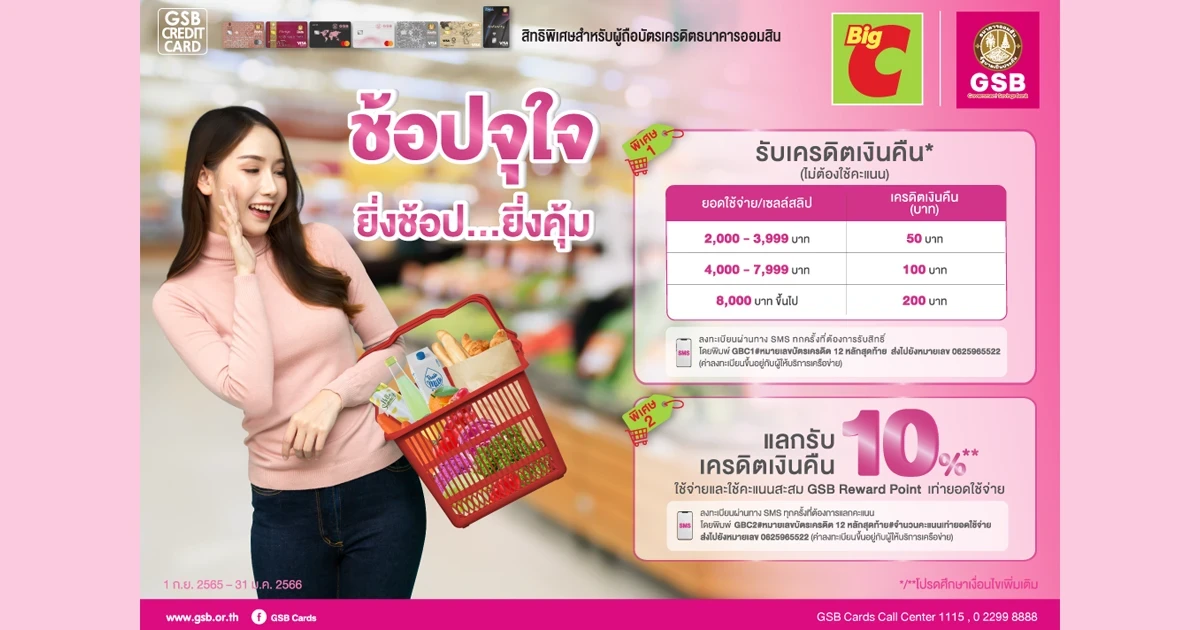 - ใช้จ่ายผ่านบัตรเครดิตธนาคารออมสิน ณ Big C Supercenter, Big C Extra , Big C Jumbo, Big C Market, Mini Big C หรือ บิ๊กซีแอปพลิเคชัน, www.bigc.co.th ตั้งแต่ 500 บาทขึ้นไป/เซลล์สลิป และใช้คะแนนสะสม GSB Reward Point เท่ายอดใช้จ่าย