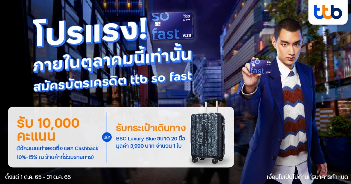 สมัครบัตรเครดิต ttb so fast และสมัครใช้บริการแอป ttb touch รับคะแนนสะสม 10,000 คะแนน (คะแนนปกติ 500 คะแนน รวมกับคะแนนพิเศษ 9,500 คะแนน) เพียงมียอดใช้จ่ายสะสม 5,000 ขึ้นไป ภายใน 30 วัน หลังจากบัตรเครดิตได้รับการอนุมัติ